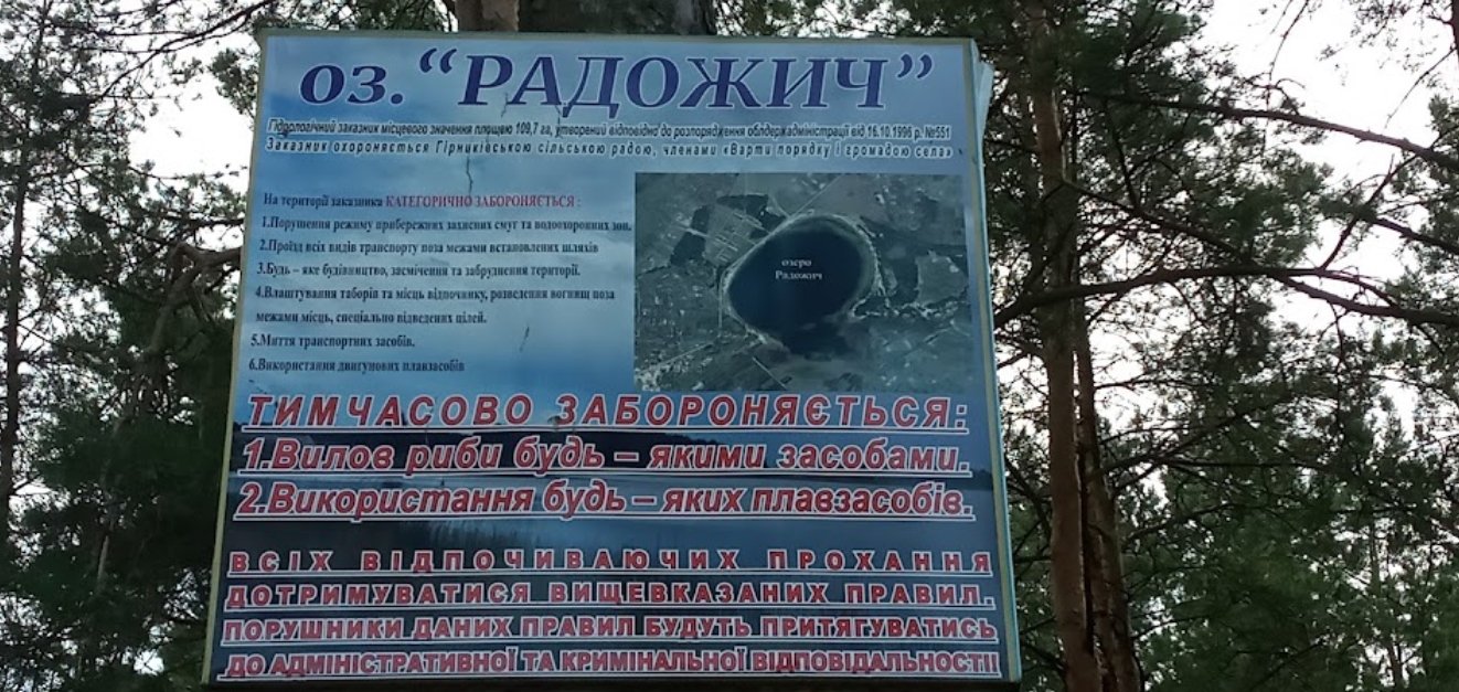 | Короткий опис. | На жаль, зараз на озері "Радожичі" у Волинській області риболовля та плавання на човнах заборонені. Це пов'язано з обмеженнями та регулюваннями, встановленими місцевими органами влади або з метою збереження екологічного балансу водойми. Рекомендується дотримуватись цих правил та шанувати природні резерви озера "Радожичі" під час відпочинку. |